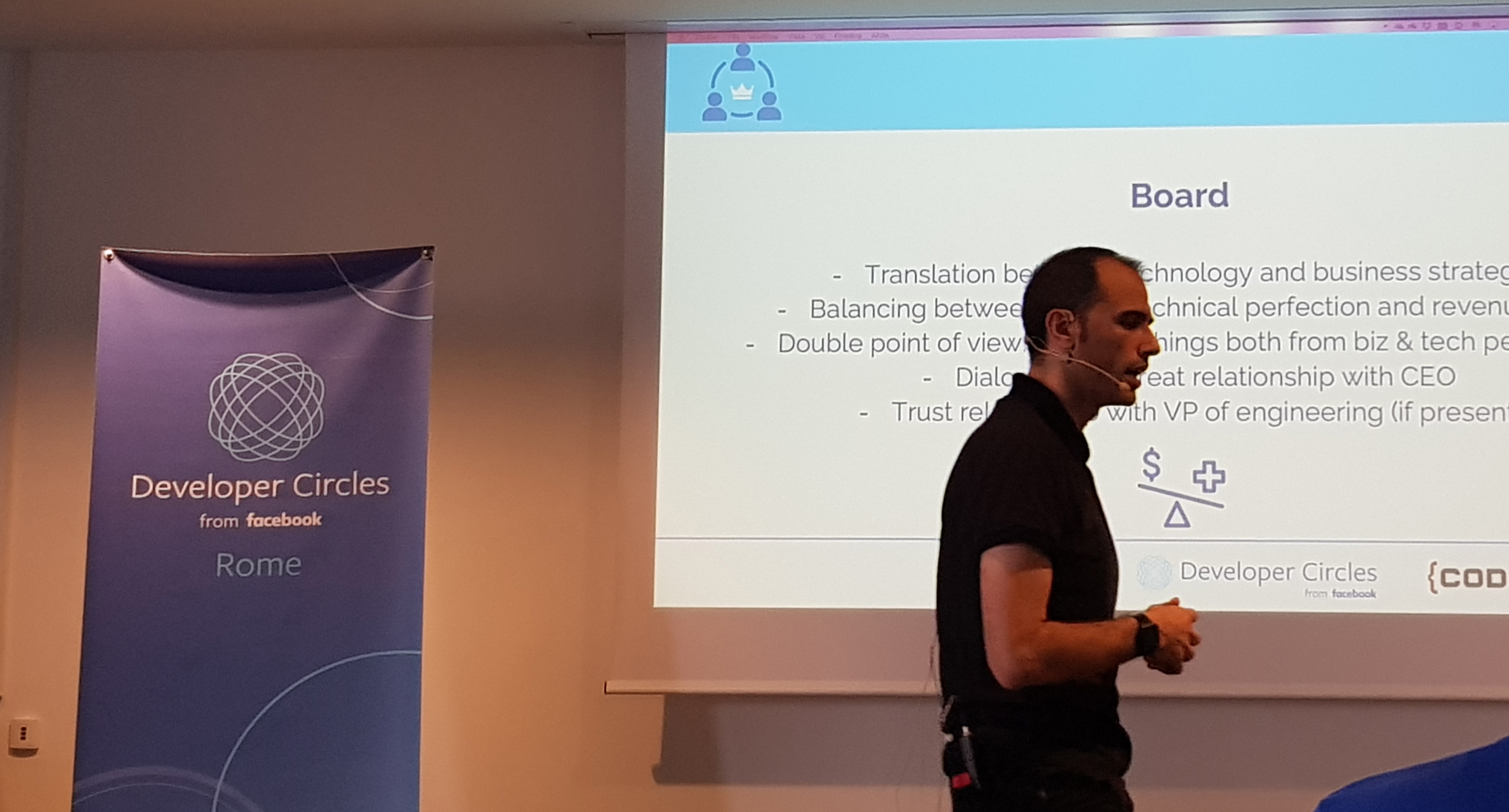 Today I was pleased to attend to the "From Developer to CTO" Bootcamp, the final phase of the Tech Leadership Training Course: an online program promoted by Facebook Developer Circles in partnership with Codemotion and designed to help developers in their journey to become Chief Technical Officers by combining strong interpersonal, influential and technical skills.
