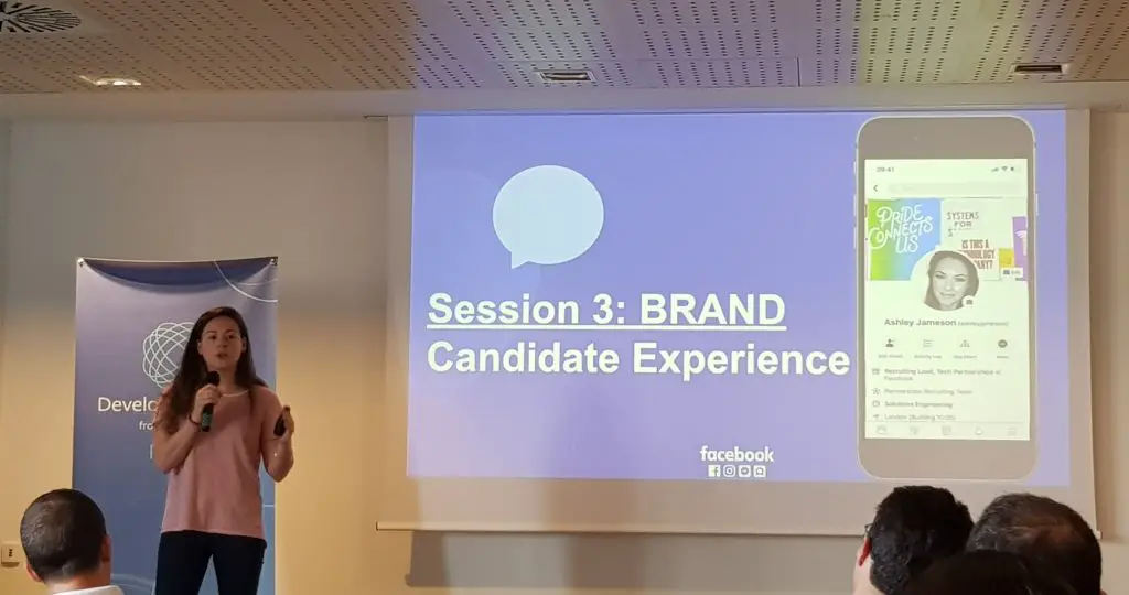 Right after the selfie lottery guys it was the turn of Emer O’Leary & Ashley Jameson: after a brief introduction, they introduced us to the Facebook EMEA Recruiting Program: an enticing set of techniques aiming to build the best teams in the world and create an amazing company culture. The program strongly relies to a passionate recruiting community formed by Program Managers, Recruiters, Coordinators and Sourcers: they explained quite well how all of these people work together to bring the world's best talent to Facebook.