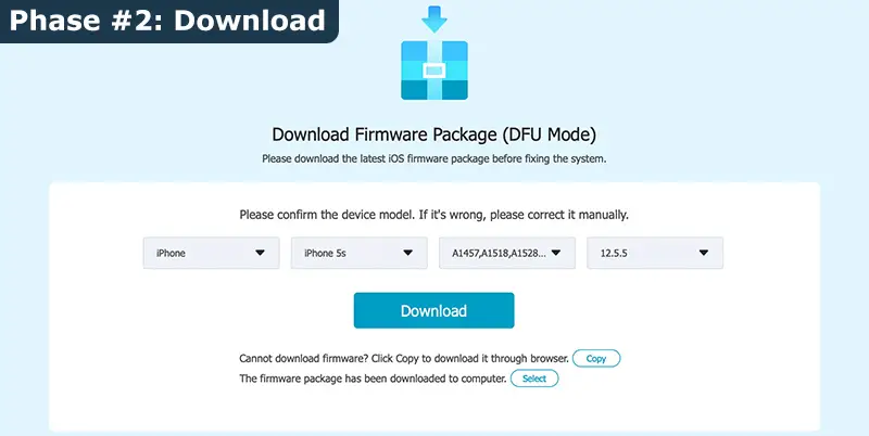 - Fase #2: Download. Il software proverà a rilevare automaticamente il dispositivo, tuttavia, poiché è probabile che sia bloccato, potrebbe non riuscire a farlo; in tal caso, ti verrà data la possibilità di selezionare manualmente il modello del dispositivo. Una volta terminato, puoi fare clic sul pulsante Download per recuperare l'ultimo pacchetto firmware iOS disponibile per la versione specificata del tuo dispositivo, che è un requisito per eseguire il processo di ripristino del sistema.