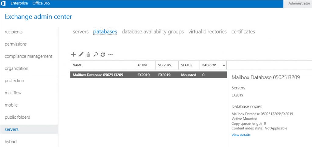 La certezza che il problema sia legato a un malfunzionamento del database di MS Exchange può essere ottenuta collegandosi alla Exchange Management Interface, raggiungibile tramite un link apposito presente all'interno nel menu MS Exchange creato a seguito dell'installazione. Una volta connessi, è possibile immediatamente verificare se il database è installato e raggiungibile (Mounted) oppure no (Unmounted).