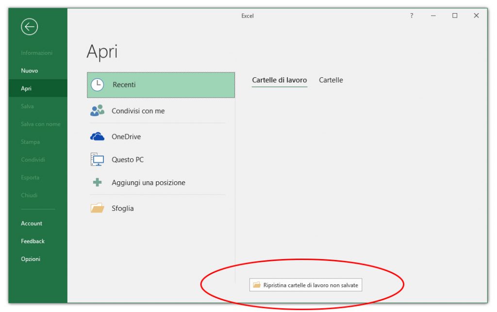 - Excel: Fare clic sul menu File, quindi selezionare Recenti e infine su Ripristina cartelle di lavoro non salvate.